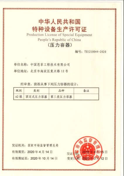 • 中華人民共和國特種設(shè)備生產(chǎn)許可證(壓力容器)